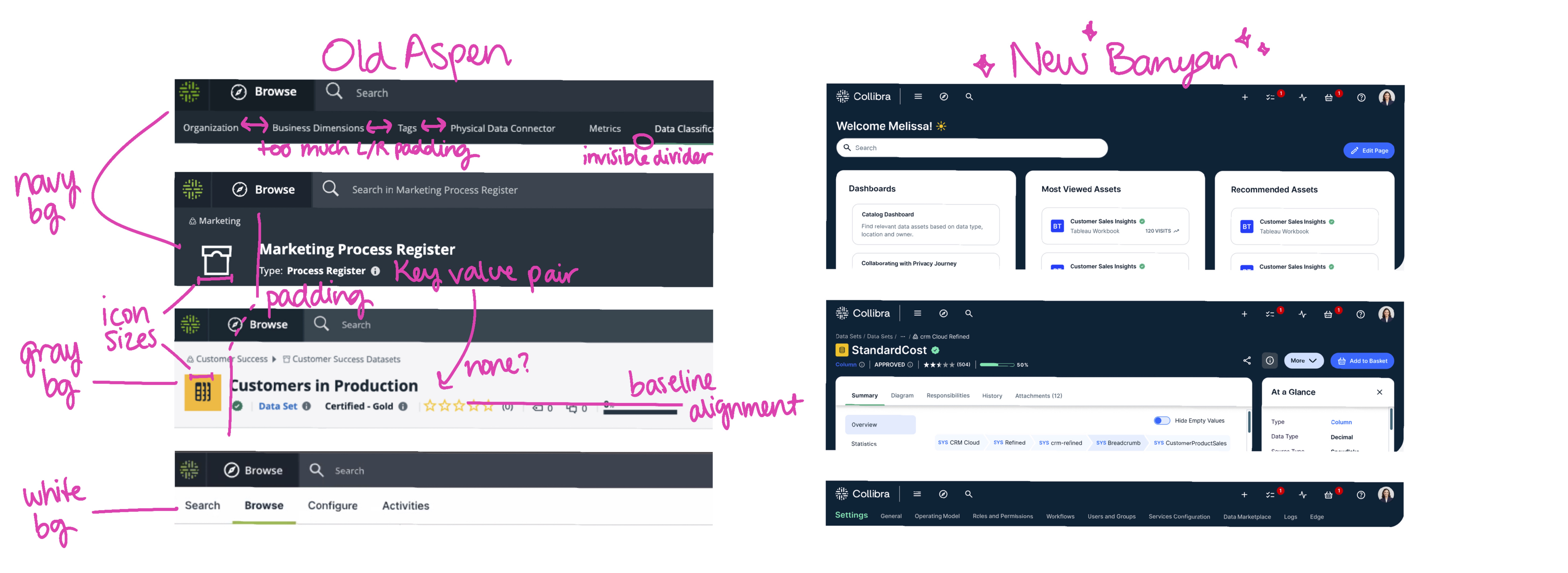 In 2022, the #1 piece of feedback Collibra received after failed sales engagements was "the UI is ugly" and "not user-friendly." Our Arbor Design System needed a major upgrade, and fast! Colors and typography were revamped, flows were simplified, sketches and mockups were presented, detailed designs were delivered and reviewed. All the while, we gut-checked ourselves constantly with users and key stakeholders to ensure Banyan was beautiful and true to the Collibra spirit.